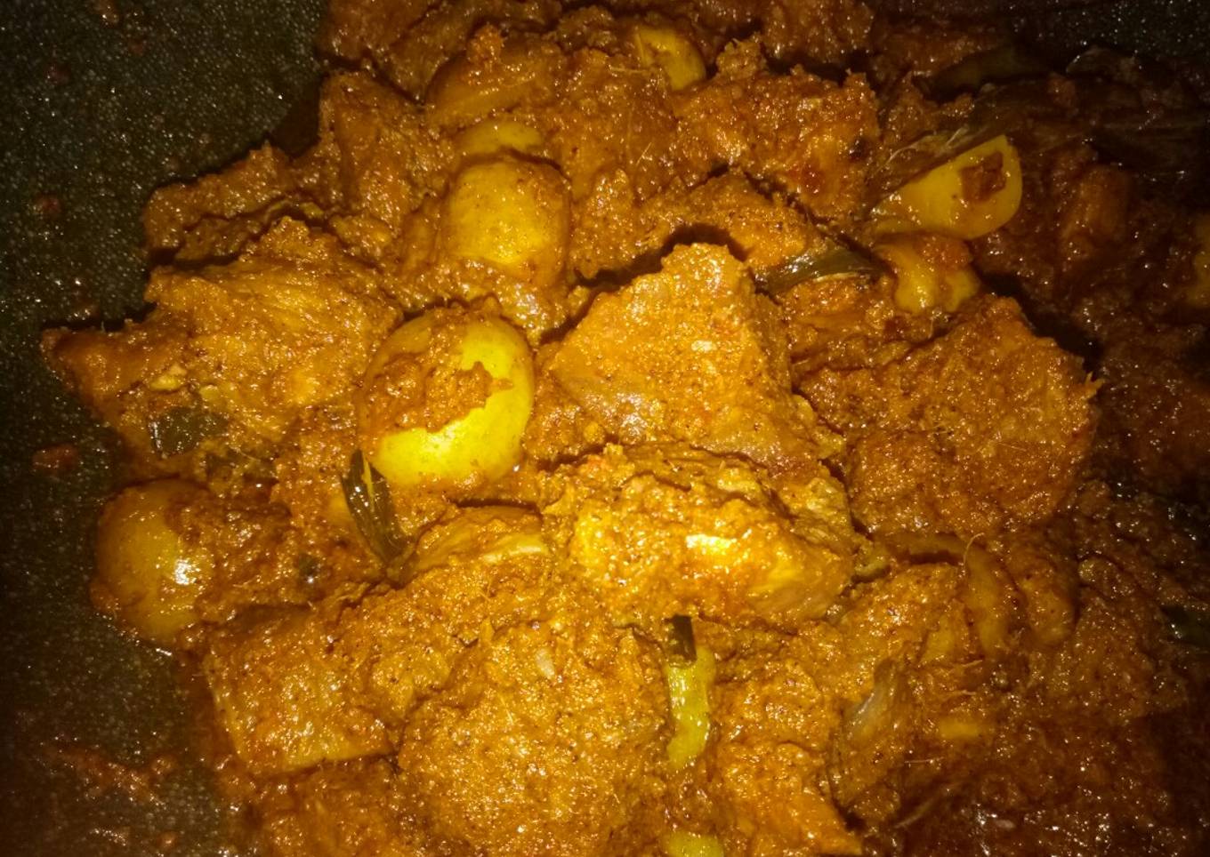 - Tumis bumbu rendang sampai harum, lalu masukkan daging aduk, lalu masukkan kentang, dan santan, jangan lupa diaduk agar santan tidak mengumpal.